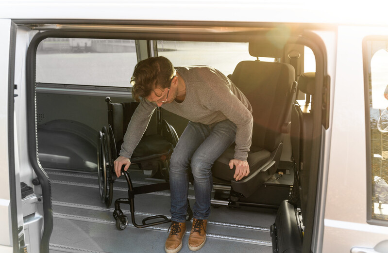 Transfer vom Rollstuhl auf den Vordersitz im Fahrzeug.